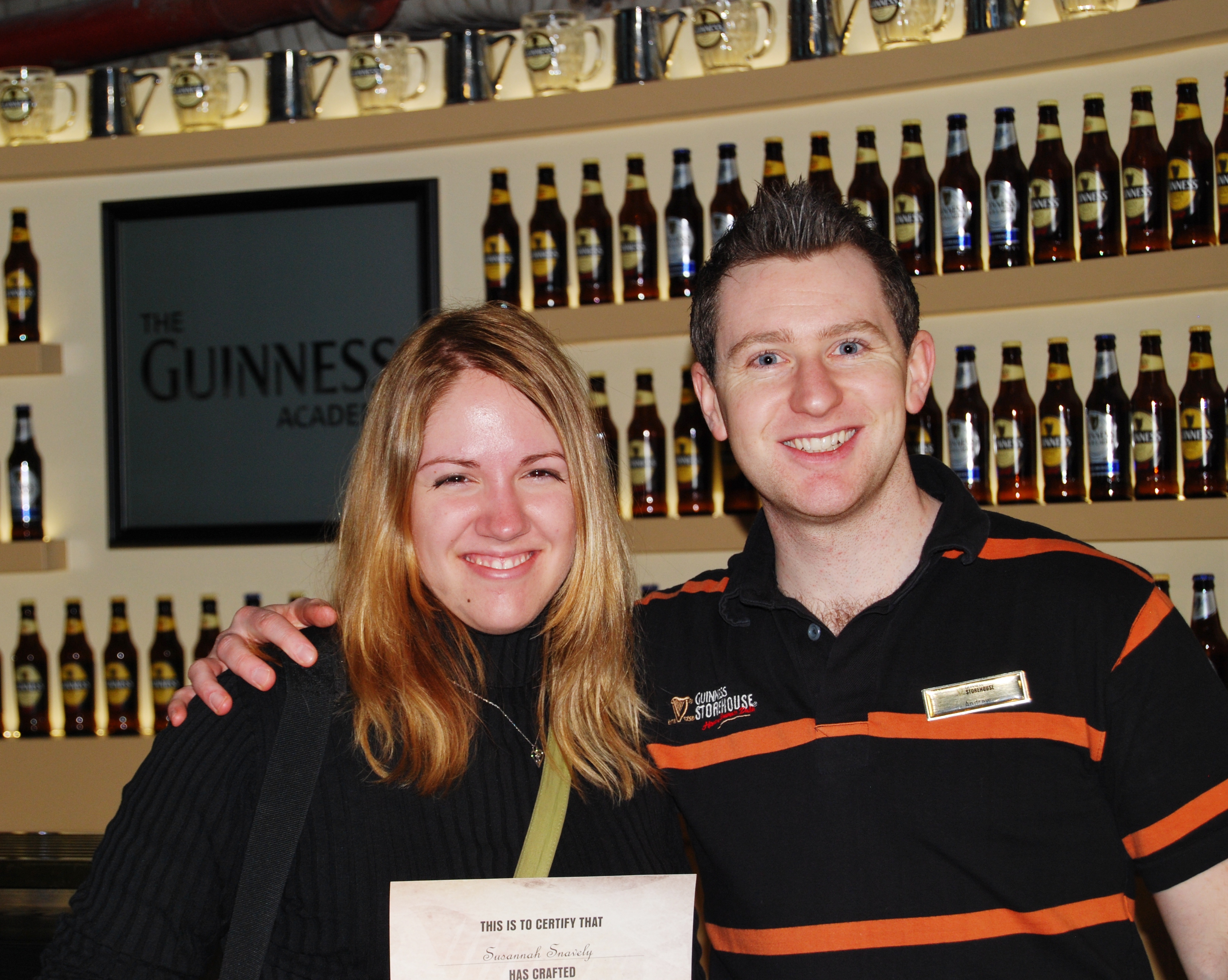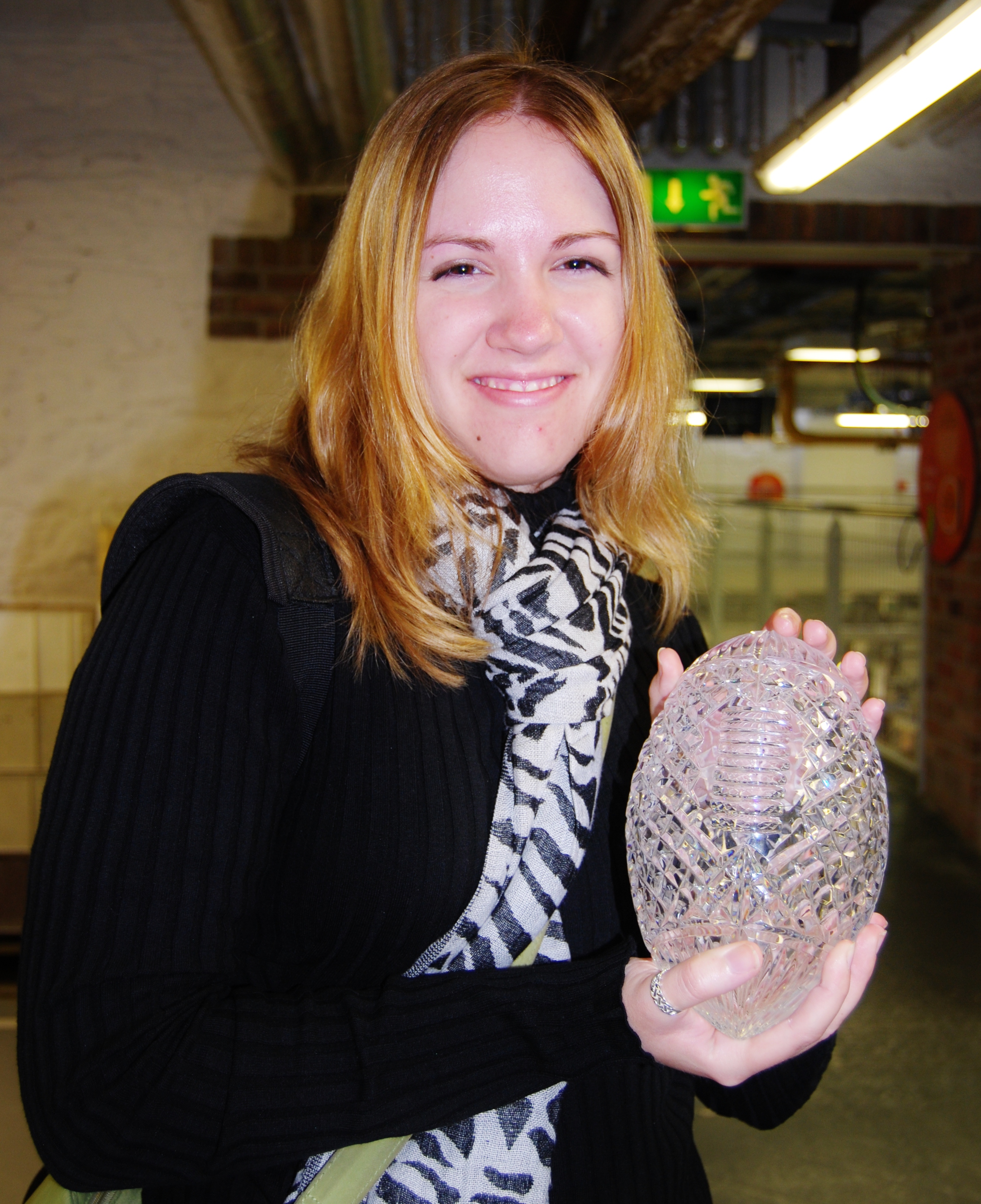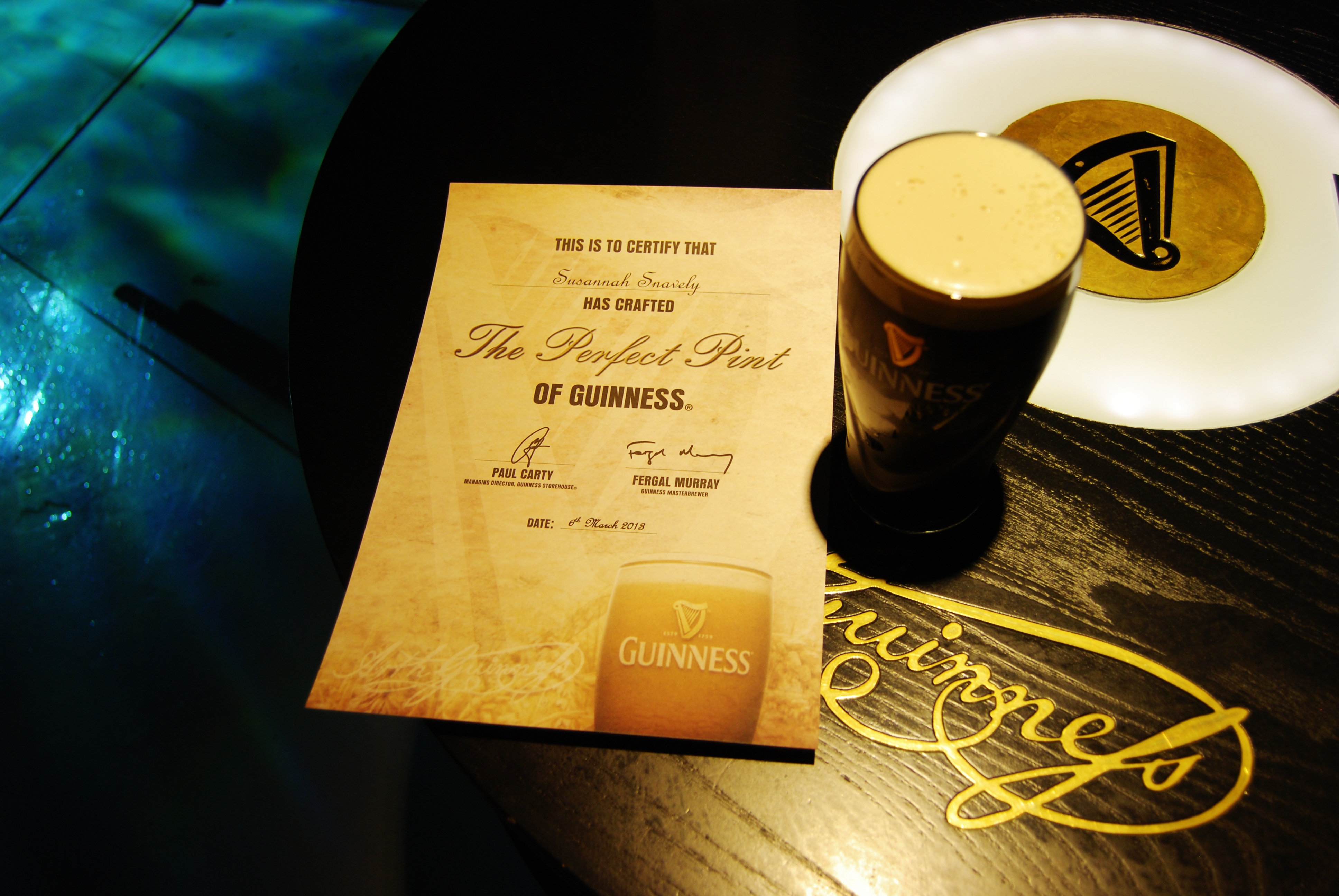 Upon reaching the hotel, we stripped off our wet clothes and went to the Ritz’s Sugar Loaf Lounge for tea and hot chocolate. After warming up, we headed for the spa. The indoor pool at the Powerscourt Ritz is beautiful. Swarovski crystals are imbedded into the bottom of the pool, causing the water to sparkle in the light. The hot pool was also great, with benches created to fit the shape of your body and bubbles rising out of them. Our only complaint was that the water was only lukewarm, not the 105 degrees that we prefer in America. However, if heat was what we were looking for, we didn’t have to look far! The steam room was so excruciatingly hot that I couldn’t breathe in it without having a coughing fit. I couldn’t take more than 5 minutes sitting inside, and I quickly left to shower. During our time in the pool, Avonie met a handsome Brazilian by the name of Cassio. They quickly hit it off, and she is hoping to see him again in Dublin before we leave. I also met a delightful woman named Libby, who works at a Massage Envy in L.A. She and her boyfriend had also bought the Groupon, and we discussed the various excursions we were planning to make. Avonie and I ended the evening with a free dinner voucher at McGill’s. I ordered a giant burger, which has made me feel so full and sleepy! We also received a free drink with the meal, and I enjoyed a pint of cider that I sampled a few nights before. As I can barely keep my eyes open now, I am signing off and hitting the pillow for an early start to Waterford Crystal.